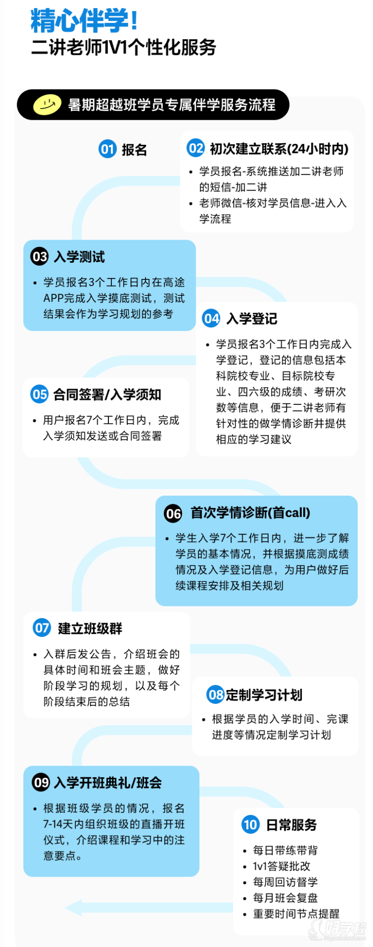 日常服务:每日带练带背,1V1 答疑批改;每周回访督学,每月班会复盘;提醒重要时间节点,课前发送到课提醒。