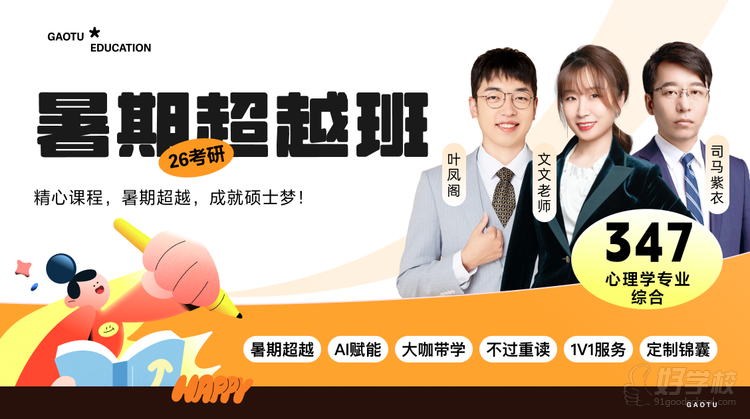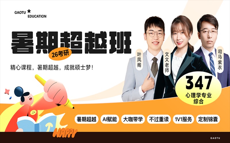 高途考研 26 考研应用心理硕士 347 心理学专业综合暑期超越班,依托 AI 赋能、大咖带学、定制锦囊与 1V1 服务,以 “导讲练测评伴” 六大备考动能为核心,助力考生解决知识难、记忆弱、规划乱等考研痛点,实现暑期高效突破,冲刺硕士目标。