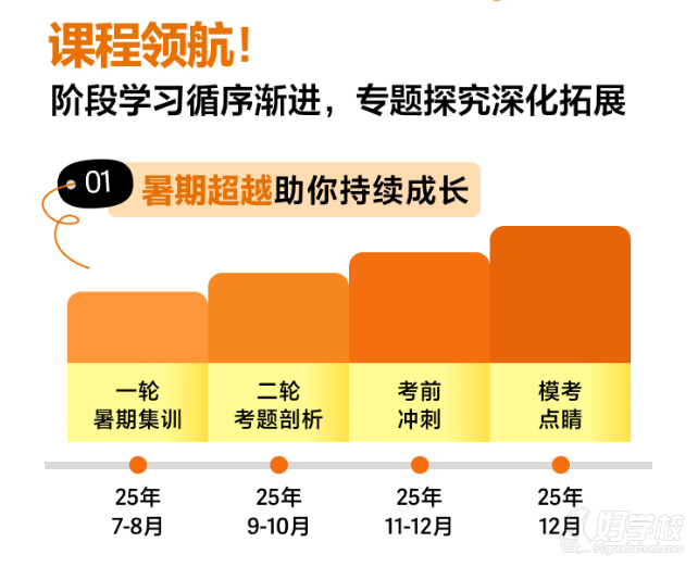 科学备考体系:打造 “导 - 讲 - 练 - 测 - 评 - 伴” 闭环,从定制学习规划、分层授课,到在线题库练习、阶段考试测评,再到全程伴学跟踪,层层递进提升学习效果。