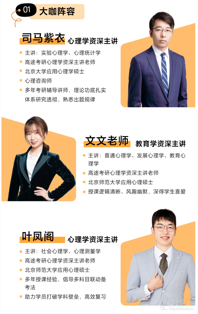 叶凤阁:北京师范大学应用心理硕士,高途考研心理学资深主讲,主讲社会心理学、心理测量学,拥有多年授课经验,倡导多科目联动备考法,帮助打破学科壁垒。