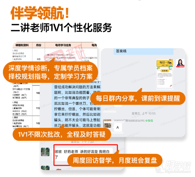 日常服务:提供每日带练带背、1V1 不限次答疑批改;每周进行回访督学,每月开展班会复盘;同步提醒重要时间节点,确保学习不脱节。