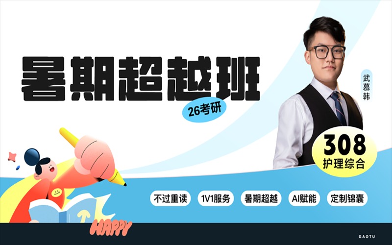 本课程由高途推出,专为 26 考研护理硕士考生打造,聚焦 308 护理综合科目,以 “暑期超越” 为核心目标,助力考生高效备考,还提供不过重读与 1V1 服务,搭配 AI 赋能技术提升学习效果。