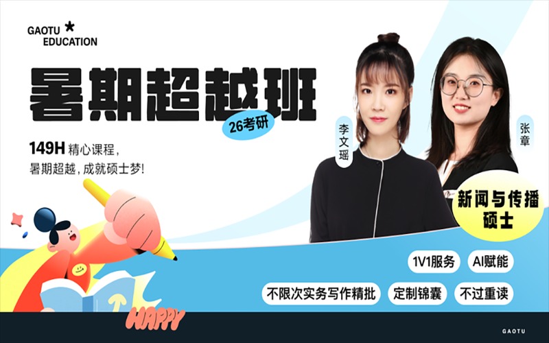 高途 26 考研新闻与传播硕士暑期超越班,以 149H 精心课程为核心,搭配 “导讲练测评伴” 六大备考动能,助力学员攻克新传考研难题,实现暑期超越,成就硕士梦想,课程定价 4980 元,还提供不过重读确保。