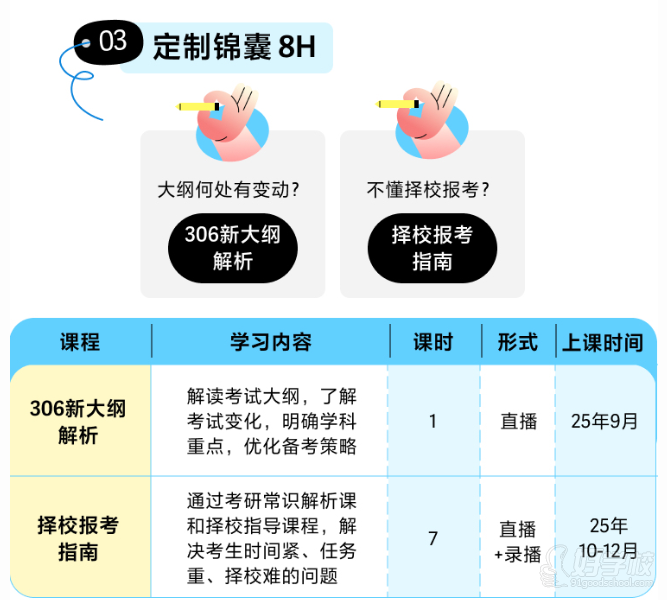 定制服务,全程陪伴:为学员提供定制学习方案、择校规划指导,建立专属学员档案,进行深度学情诊断;24 小时内完成学员初次联系,7-14 天内组织直播开班仪式,重要时间节点及时提醒,全程陪伴学员考研路。
