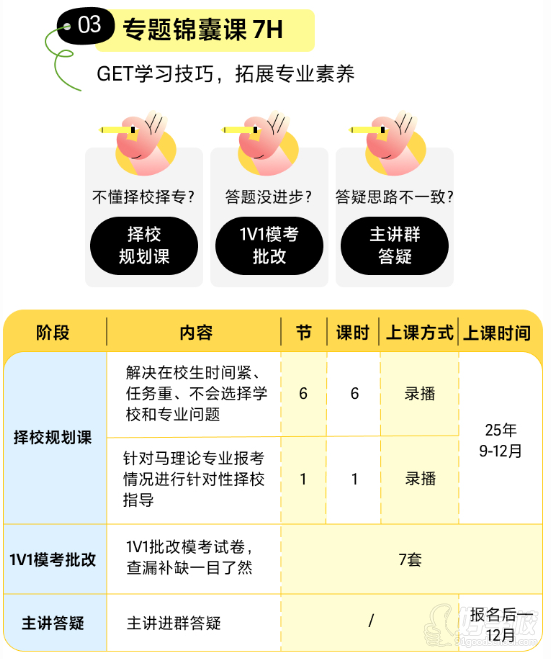 定制服务,全程陪伴:为学员提供定制学习方案、择校规划指导,建立专属学员档案,进行深度学情诊断;24 小时内完成学员初次联系,7-14 天内组织直播开班仪式,重要时间节点及时提醒,全程陪伴学员考研路。