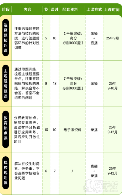 课程权益:课程有效期内支持无限回放和离线缓存,结课后再送 90 天有效期;有效期内可享受老学员扩科福利,可换课 1 次(需扣除相关费用);满足所购科目未达国家线、参加 2025 年 12 月研究生考试、初试前课程听课率达 80% 以上(不含离线缓存)条件,可免费重读,重读课程与原报名科目、班型对应,需在国家线公布后 30 天内申请。