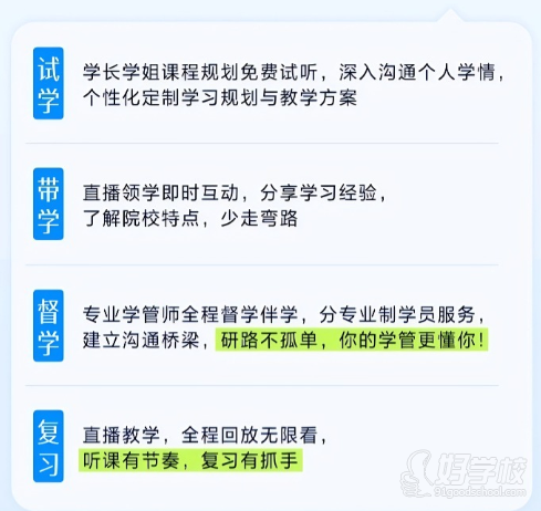 督学:专业学管师全程督学伴学,分专业制学员服务建立沟通桥梁,研路不孤单,你的学管更懂你!