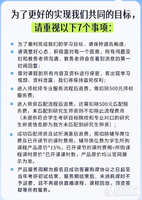 需对课程的所有内容及资料进行保密,若出现学习视频、资料泄露,我们将保持追究权利;进入择校择专业服务流程后退费,需扣除500元择校服务费;