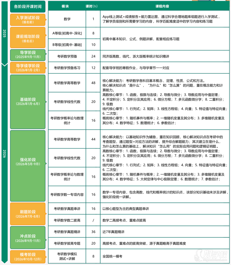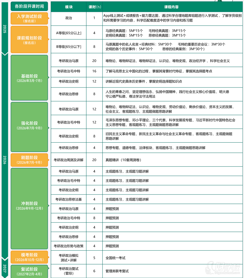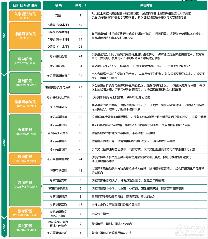 基础夯实阶段:词汇语境化/语法公式化;考研政治各科知识精讲;考研数学基础能力提升
