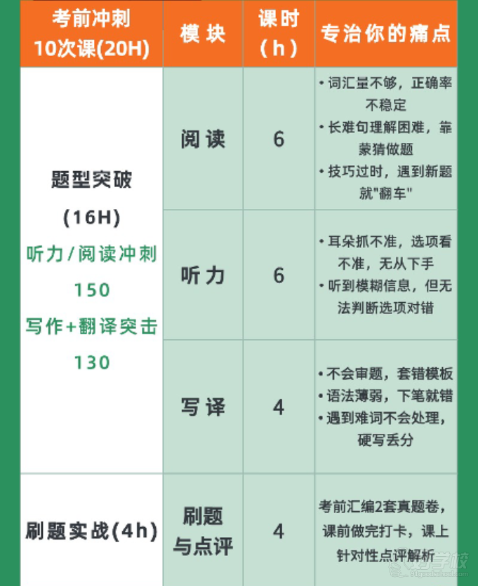 题型突破涵盖阅读(6 小时)、听力(6 小时)、写译(4 小时):阅读板块专治 “词汇量不足正确率不稳定、长难句理解困难靠蒙猜、技巧过时遇新题就‘翻车’”;