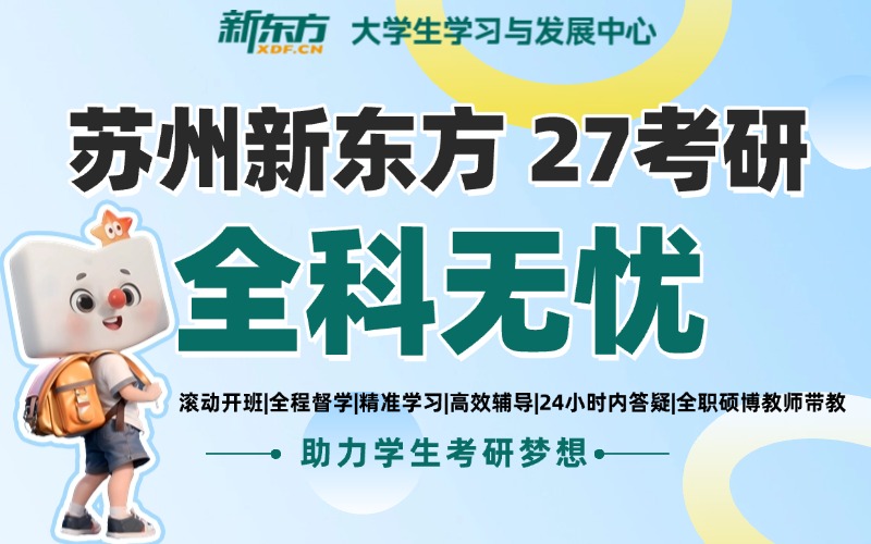 新东方大学生学习与发展中心是新东方教育科技集团下的大学教育品牌。 苏州新东方大学生学习与发展中心自成立以来,凭借其优质师资和贴心服务为广大学员提供考研全科、考博、四六级、专四专八、教资、财会等课程培训,突破传统教学方法,通过活跃高效的教学氛围,充分激发学员学习潜力,为大学生和在职人群提供高质量的线上及线下教育产品。