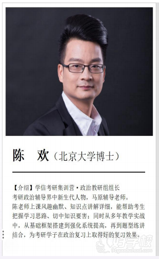 学信考研集训营.政治教研组组长考研政治辅导界中新生代人物,马原辅导老师。陈老师上课风趣幽默、知识点讲解详细,能帮助考生把握学习思路、切中知识要害:同时从多年教学实战中,从基础框架搭建到强化系统提高,再到题型练讲结合,为考研学子在政治复习上取得好的复习效果。