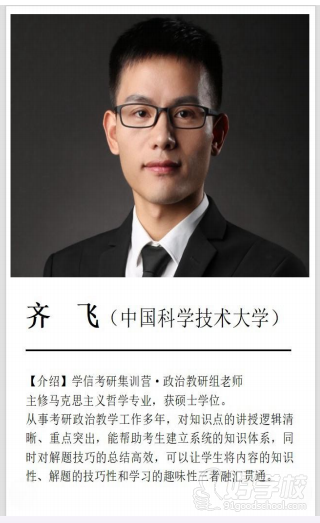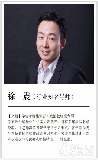 学信考研集训营.政治教研组老师考研政治辅导中生代实力派代表,拥有多年实战教学经验。徐老师深谙考研学子的学习弱点,善于帮助考生在短时间内构建政治复习框架;授课逻辑清晰,对重点难点与考试要点把握精准、一针见血。