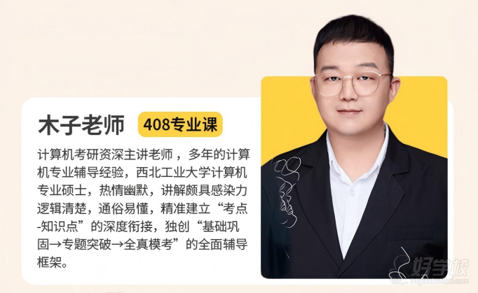 计算机考研资深主讲老师,多年的计算机专业辅导经验,西北工业大学计算机专业硕士,热情幽默,讲解颇具感染力逻辑清楚,通俗易懂,精准建立"考点-知识点"的深度衔接,独创"基础巩固专题突破全真模考"的全面辅导框架。