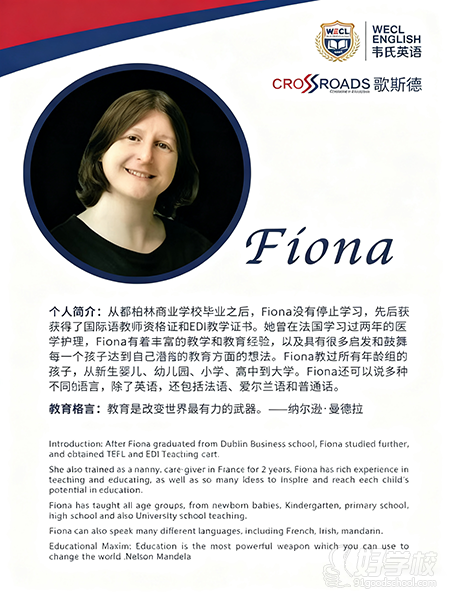 个人简介:从都柏林商业学校毕业之后,Fiona没有停止学习,先后获得了国际英语教师资格证和EDI教学证书。她曾在法国学习过两年的医学护理,Fiona有着丰富的教学和教育经验,以及具有很多启发和鼓舞每一个孩子达到自己潜能的教育方面的想法。Fiona教过所有年龄组的孩子,从新生婴儿、幼儿园、小学、高中到大学。Fiona还可以说多种不同的语言,除了英语,还包括法语、爱尔兰语和普通话。