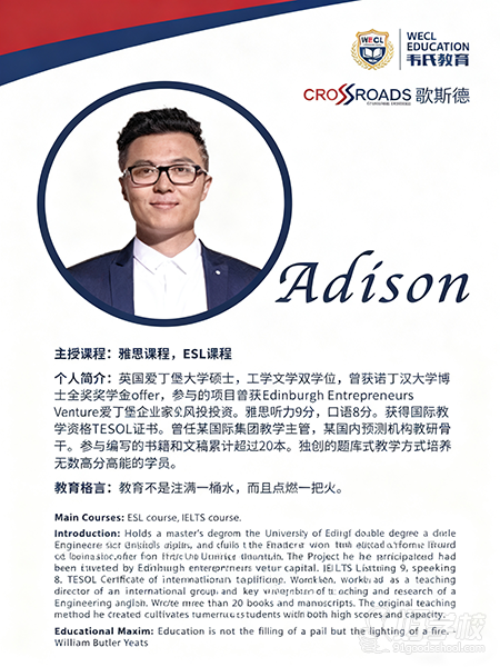 个人简介:英国爱丁堡大学硕士,工学文学双学位,曾获诺丁汉大学博士全奖奖学金offer,参与的项目曾获EdinburghEntrepreneursVenture爱丁堡企业家风投投资。雅思听力9分,口语8分。获得国际教学资格TESOL证书。曾任某国际集团教学主管,某国内预测机构教研骨干。参与编写的书籍和文稿累计超过20本。独创的题库式教学方式培养无数高分高能的学员。