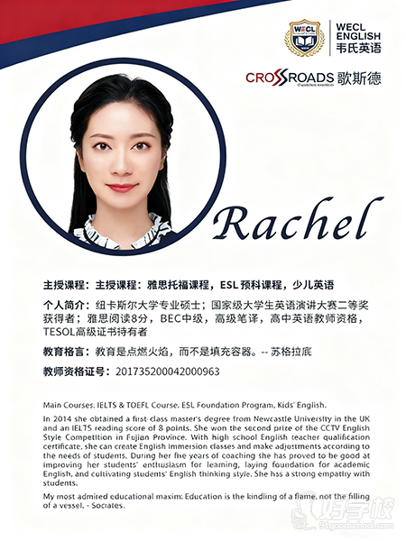 个人简介:纽卡斯尔大学专业硕士;国家大学生英语演讲大赛二等奖获得者;雅思阅读8分,BEC中级,高级笔译,高中英语教师资格,TESOL高级证书持有者