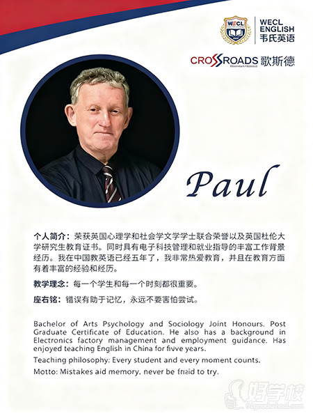 荣获英国心理学和社会学文学学士联合荣誉以及英国杜伦大学研究生教育证书。同时具有电子科技管理和就业指导的丰富工作背景经历。我在中国教英语已经五年了,我非常热爱教育,并且在教育方面有着丰富的经验和经历。