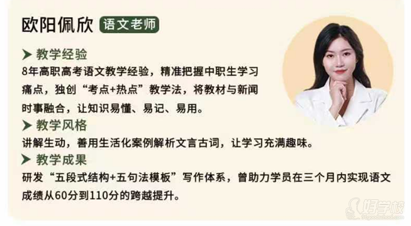 教学经验:8 年高职高考语文教学经验,精准把握中职生学习痛点,独创 “考点 + 热点” 教学法,将教材与新闻时事融合,让知识易懂、易记、易用。
