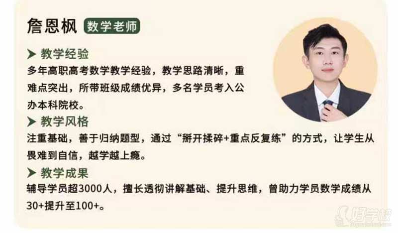 教学经验:多年高职高考数学教学经验,教学思路清晰,重难点突出,所带班级成绩优异,多名学员考入公办本科院校。