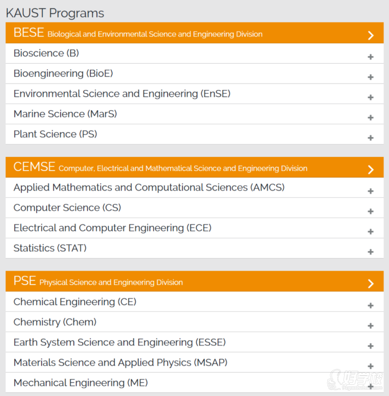 KAUST 研究生项目按三大核心学部(Division)划分,各学部及下属专业如下: