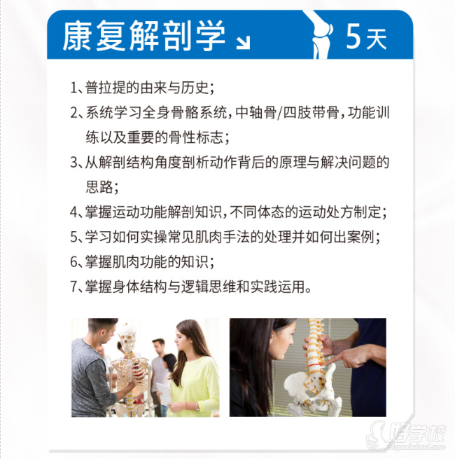 探寻普拉提的由来与历史,系统学习全身骨骼系统,从解剖结构角度剖析动作背后的原理与解决问题的思路。掌握运动功能解剖知识,能为不同体态制定运动处方;学习实操常见肌肉手法处理并出案例,还会掌握肌肉功能知识,以及身体结构在逻辑思维和实践中的运用。