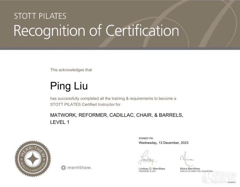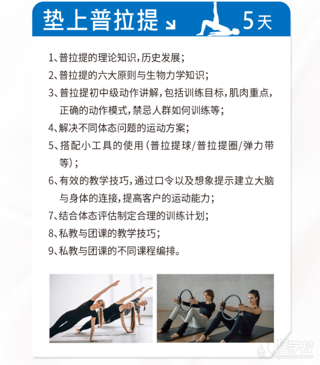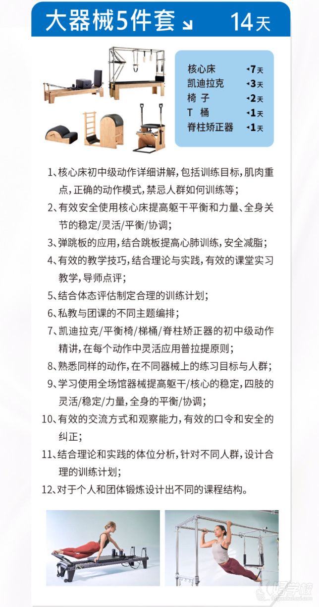 详细讲解核心床、凯迪拉克、椅子、T 桶、脊柱矫正器等器械的初、中级动作,包含训练目标、肌肉重点、正确动作模式及禁忌人群训练方法。学习安全有效使用核心床提升躯干平衡和力量、全身关节的稳定等;掌握弹跳板应用以提高心肺训练、安全减脂;结合理论与实践进行有效课堂实习教学,导师点评;能结合体态评估制定合理训练计划,进行私教与团课的不同主题编排;在每个动作中灵活应用普拉提原则,熟悉同样动作在不同器械上的练习目标与人群;学习使用全场馆器械提高躯干 / 核心稳定、四肢灵活等,掌握有效交流、观察能力,口令和安全纠正方法;结合理论和实践进行体位分析,针对不同人群设计合理训练计划,为个人和团体锻炼设计不同课程结构。