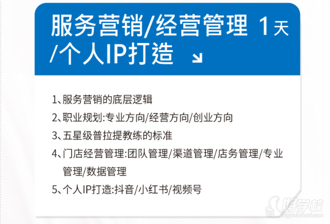 揭秘服务营销底层逻辑,进行职业规划(专业、经营、创业方向),明确五星级普拉提教练标准,学习门店经营管理(团队、渠道、店务、专业、数据管理),以及通过抖音、小红书、视频号打造个人 IP。
