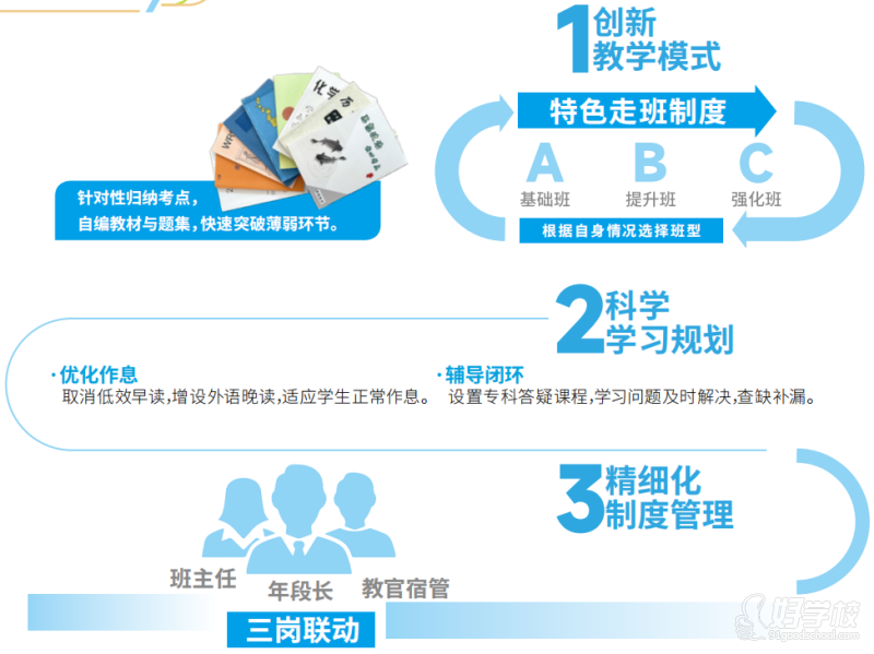 严格管理:实行【晨检 - 课堂 - 离校】三级考勤,电子设备统一管理,违禁物品定期检查,加强学风建设。
