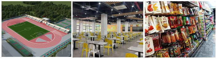 学校内运动空间、图书馆、食堂、超市与快递服务一应俱全,一站式满足学生日常需求,为学业保驾护航。
