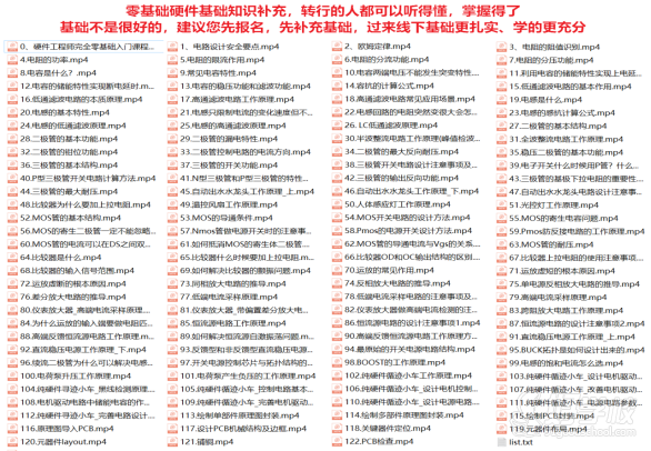 新增搭建硬件基础知识学习,主要是针对硬件基础知识不扎实或者转行的学员,在学习PCB设计之前对基本的硬件知识:电阻、电容、电感、二极管、三级管、MOS管、运放等做一个掌握。这部分内容报名之后马上授权进行视频播放的学习,来凡亿之后上课对硬件基础就会有一定的基础,不至于基础跟不上而烦恼,这部分知识是完全零基础都能听懂的,是以初中物理知识背景来讲解的。