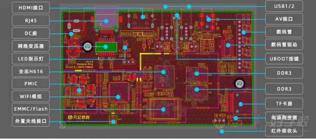 大纲介绍:基本PCB设计流程和前面类似,本案例采用4层全志H616方案,搭载2片DDR3内存,支持EMMC5.0及兼容NANDFLASH存储方案。主要支持HDMI高清视频、AV音视频、USB、有线网络及PMU、DCDC、LDO、RJ45网口等功能,案例素材复杂程度更高,要求学员综合能力更高,如下图。