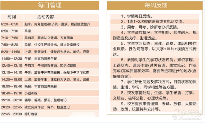 专业班主任+任课教师+辅导老师相结合(专业班主任是结合教育学、心理学、 管理学、社会学为一体的综合管理者)实施监督学习、听课、作业、测试、引领学生等日常管理工作,专家级一线教师授课,专职辅导老师助教解答,晚自习一对一辅导,有效解决学生短板科目。