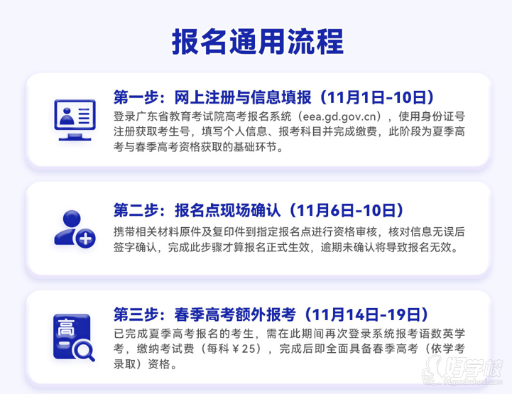 资格建立在夏季高考报名成功基础上。第一步(获取考生号)与夏季高考报名同步,按照每年报考时间(官方为准),完成夏季高考报名后自动获得资格;第二步(报考科目)为时间以官方为准,需再次登录报名系统单独报考语文、数学、英语3门学考。