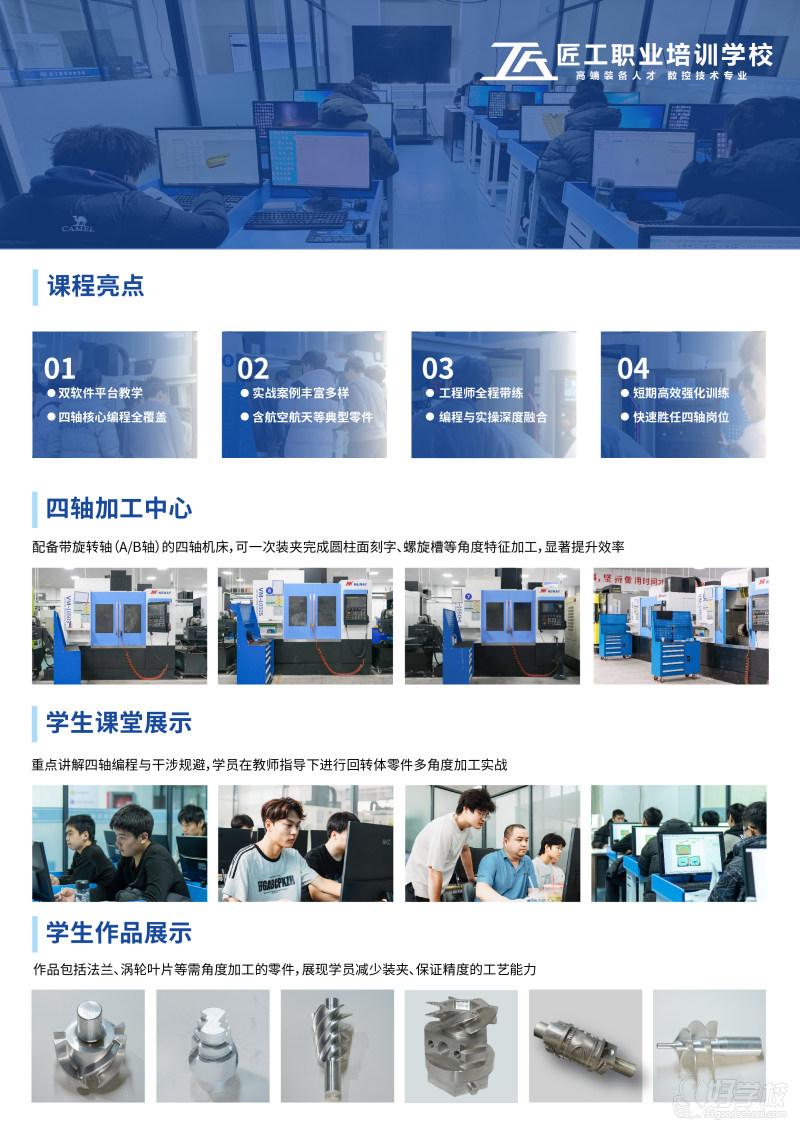 昆山市匠工职业培训学校有限公司位于昆山市巴城镇学院路388号,自有土地厂房200亩,致力于高精密(异性复杂件)产品的生产打样交钥匙工程和人才的培养。 匠工团队为企业端,高校端和社会端三类客户群体提供技术服务,师资培训,社会学员技能提升,从事数控行业20余年,2022年开始面向社会学员培训。自有高精端机床设备30余台和多年实战积累师资团队。通过“实战化”教学模式,为企业确保技术人员质量,为学校确保专业老师技能提升,为学员确保提供优质企业高薪就业,为中国高端制造业的发展贡献力量。