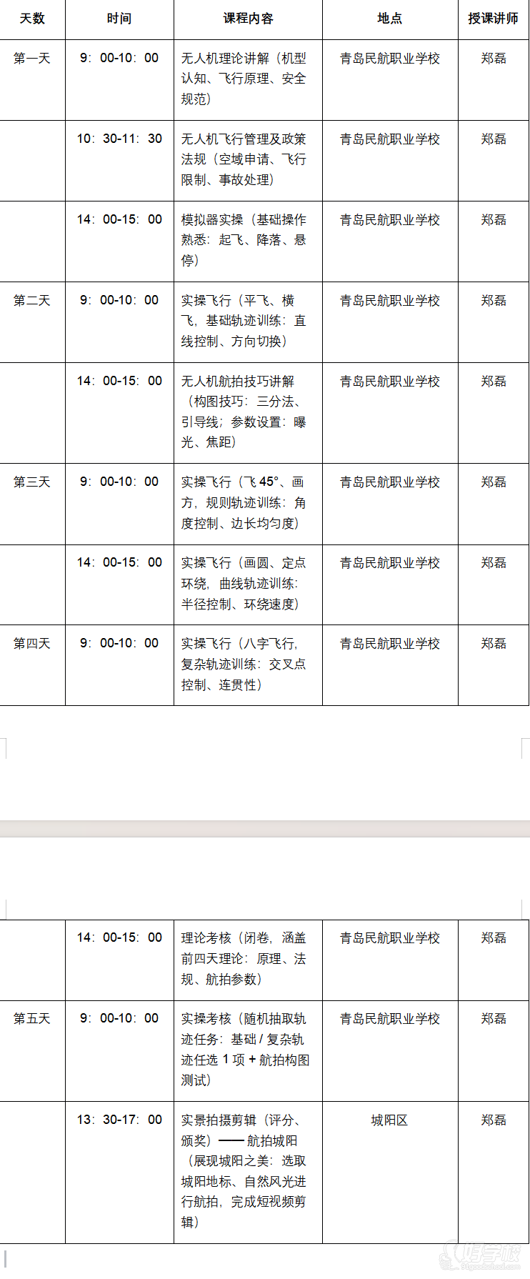 4. 通过理论与实操考核,检验学习成果,确保学员达到无人机基础操作与航拍的合格标准,为后续职业发展(如民航相关辅助作业、航拍服务等)奠定技能基础。