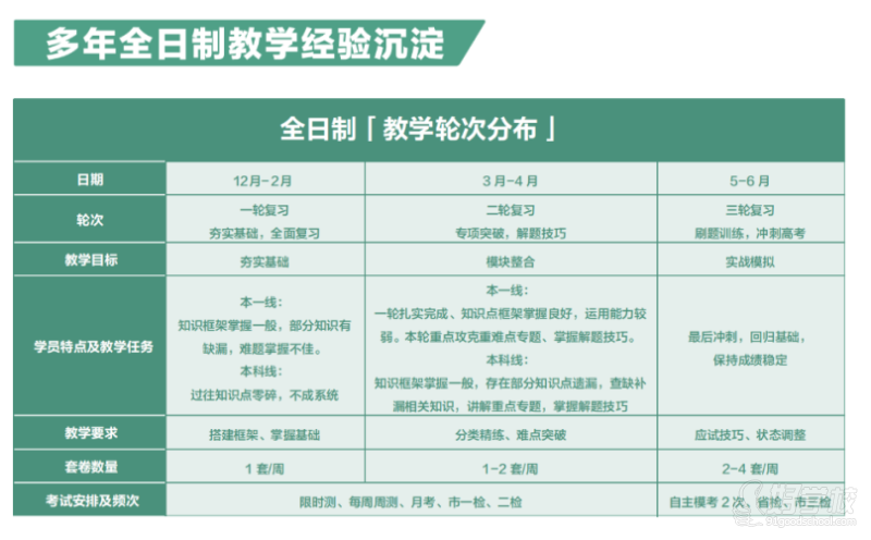 1.科学的课程体系:根据不同的阶段的教学要求,设置不同的课次与不同的考试频率。在每个阶段都有考试来检验教学效果。