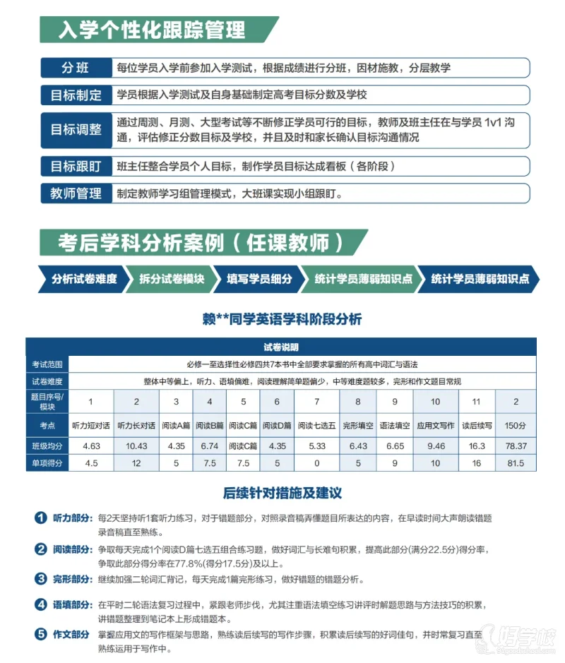 5.入学个性化跟踪管理:及时跟进学生的学习成果,针对学生薄弱点制定教学方案。