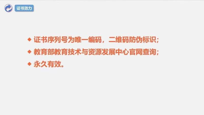 独特性与防伪性:证书序列号为独有编码,带有二维码防伪标识,可通过扫描二维码或登录教育部教育技术与资源发展中心官网进行查验,证书的真实性。