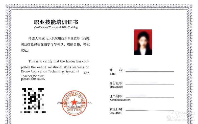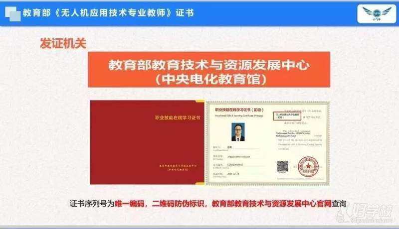 学员完成全部课程学习后,需参加线上考试。考试合格者,将获得由教育部教育技术与资源发展中心(中央电化教育馆)颁发的《无人机应用技术专业教师》职业技能培训证书。该证书具有以下显著特点: