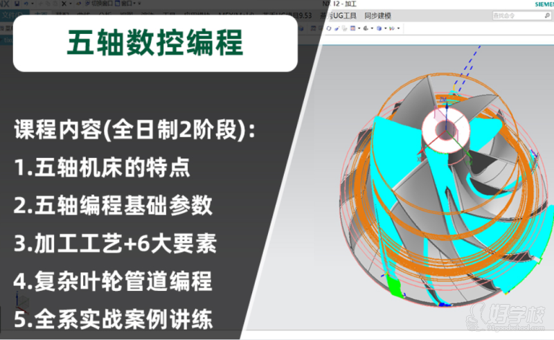 UG五轴编程参数指令可变轴轮廓铣、可变引导曲线、外形轮廓铣、深度五轴铣、顺序铣、多轴粗加工、旋转部件粗加工、多轴高级钻孔、管粗精加工、叶轮模块,实战讲解工厂实战案例叶轮、叶片、石头钻头、CT大罩、发动机零部件、汽车零部件、医疗器械、军工、航天航空件、3+2产品零件等,从图纸分析、材质特性、结构、技术要求、工艺分析、加工工装夹具再到上机实战加工,真正做到理论结合实践