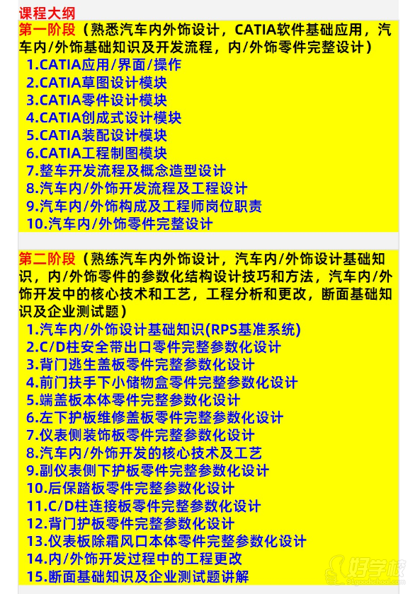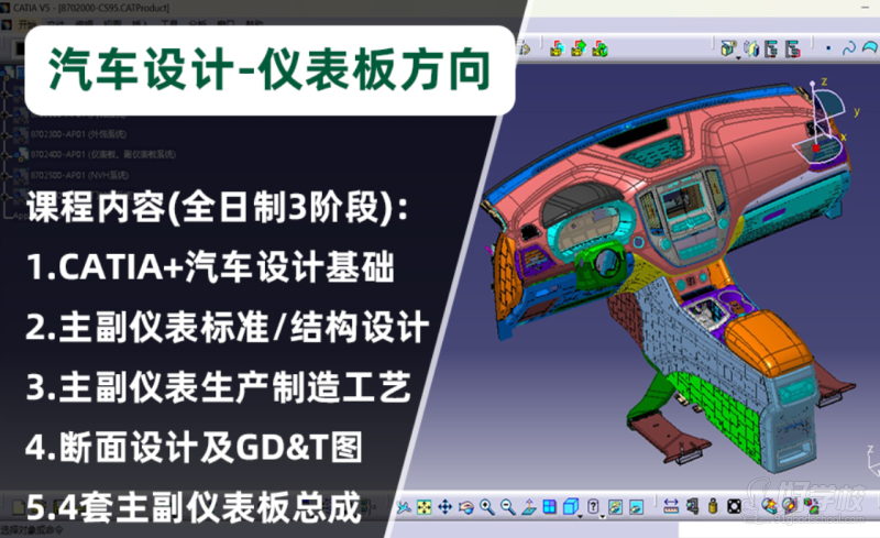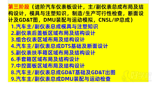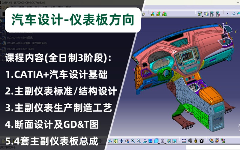 系统全面的学习汽车内/外饰设计,课程包括CATIA软件基础应用,汽车内/外饰基础知识及开发流程,内/外饰结构设计技巧和方法,汽车内/外饰开发中的核心技术和工艺。第一阶段:熟悉汽车内外饰设计,CATIA软件基础应用,汽车内/外饰基础知识及开发流程,内/外饰零件完整设计。第二阶段:熟练汽车内外饰设计,汽车内外饰设计基础知识,内/外饰零件的参数化结构设计技巧和方法,汽车内/外饰开发中的核心技术和工艺,工程分析和更改,断面基础知识及企业测试题。第三阶段:进阶汽车保险杠设计,前/后保险杠总成布局及结构设计,模具与注塑知识,制造/生产可行性检查,断面设计及GD&T图,DMU装配与运动模拟,CNSL/IP总成。