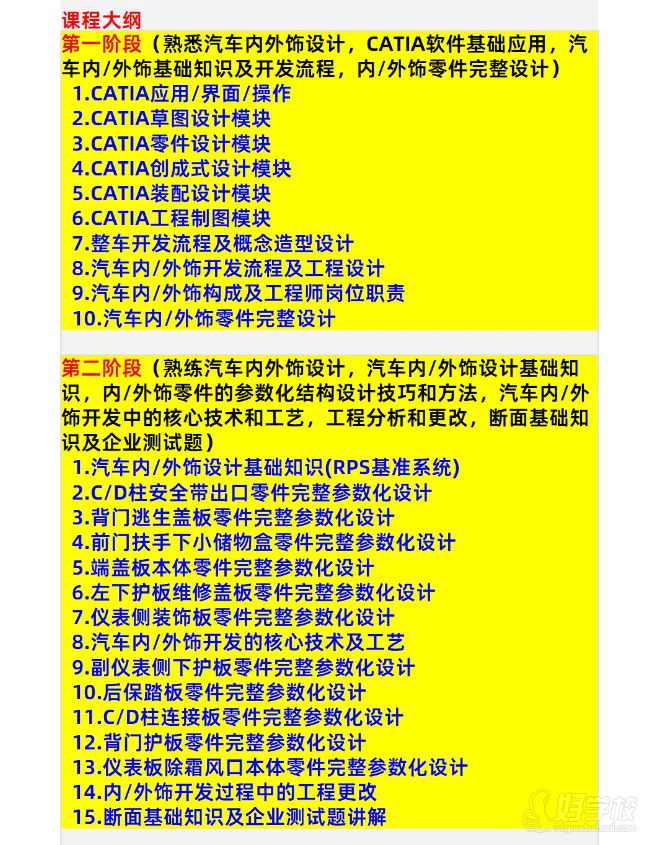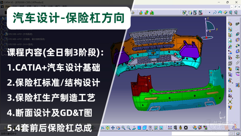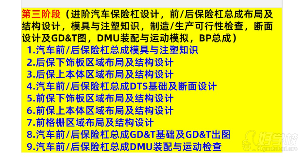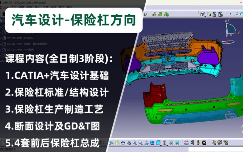 系统全面的学习汽车内/外饰设计,课程包括CATIA软件基础应用,汽车内/外饰基础知识及开发流程,内/外饰结构设计技巧和方法,汽车内/外饰开发中的核心技术和工艺。第一阶段:熟悉汽车内外饰设计,CATIA软件基础应用,汽车内/外饰基础知识及开发流程,内/外饰零件完整设计。第二阶段:熟练汽车内外饰设计,汽车内外饰设计基础知识,内/外饰零件的参数化结构设计技巧和方法,汽车内/外饰开发中的核心技术和工艺,工程分析和更改,断面基础知识及企业测试题。第三阶段:进阶汽车保险杠设计,前/后保险杠总成布局及结构设计,模具与注塑知识,制造/生产可行性检查,断面设计及GD&T图,DMU装配与运动模拟,BP总成。