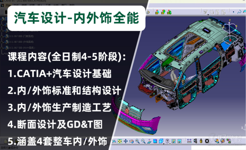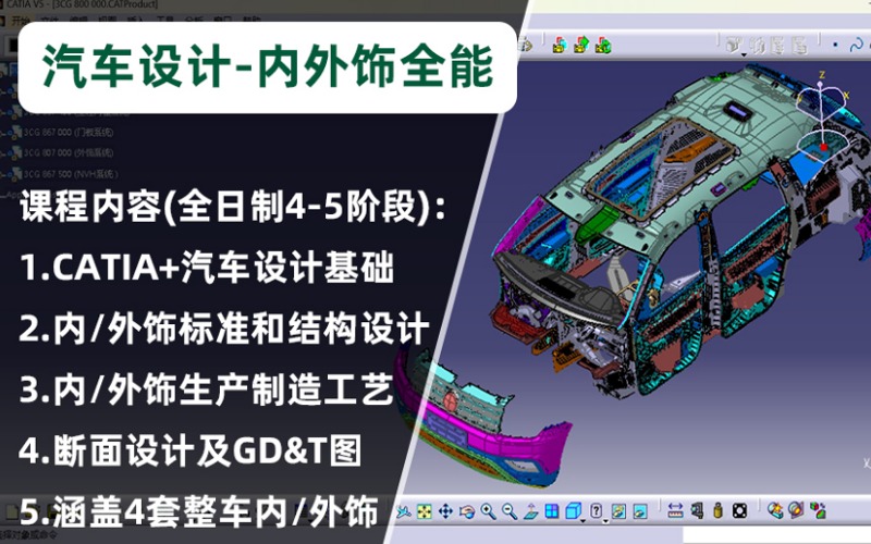 系统全面的学习汽车内/外饰设计,课程包括CATIA软件基础应用,汽车内/外饰基础知识及开发流程,内/外饰结构设计技巧和方法,汽车内/外饰开发中的核心技术和工艺。第一阶段:熟悉汽车内外饰设计,CATIA软件基础应用,汽车内/外饰基础知识及开发流程,内/外饰零件完整设计。第二阶段:熟练汽车内外饰设计,汽车内外饰设计基础知识,内/外饰零件的参数化结构设计技巧和方法,汽车内/外饰开发中的核心技术和工艺,工程分析和更改,断面基础知识及企业测试题。第三阶段:进阶汽车门饰板设计,门板/立柱/门槛总成布局及结构设计,模具与注塑知识,制造/生产可行性检查,断面设计及GD&T图,DMU装配与运动模拟。