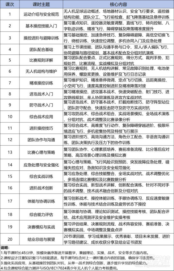 本课程系统讲授青少年无人机飞行理论+实操、从个人能力提升到团队作战。课程按模块循序渐进开展教学,兼顾理论、实操、战术、安全等多方面内容。