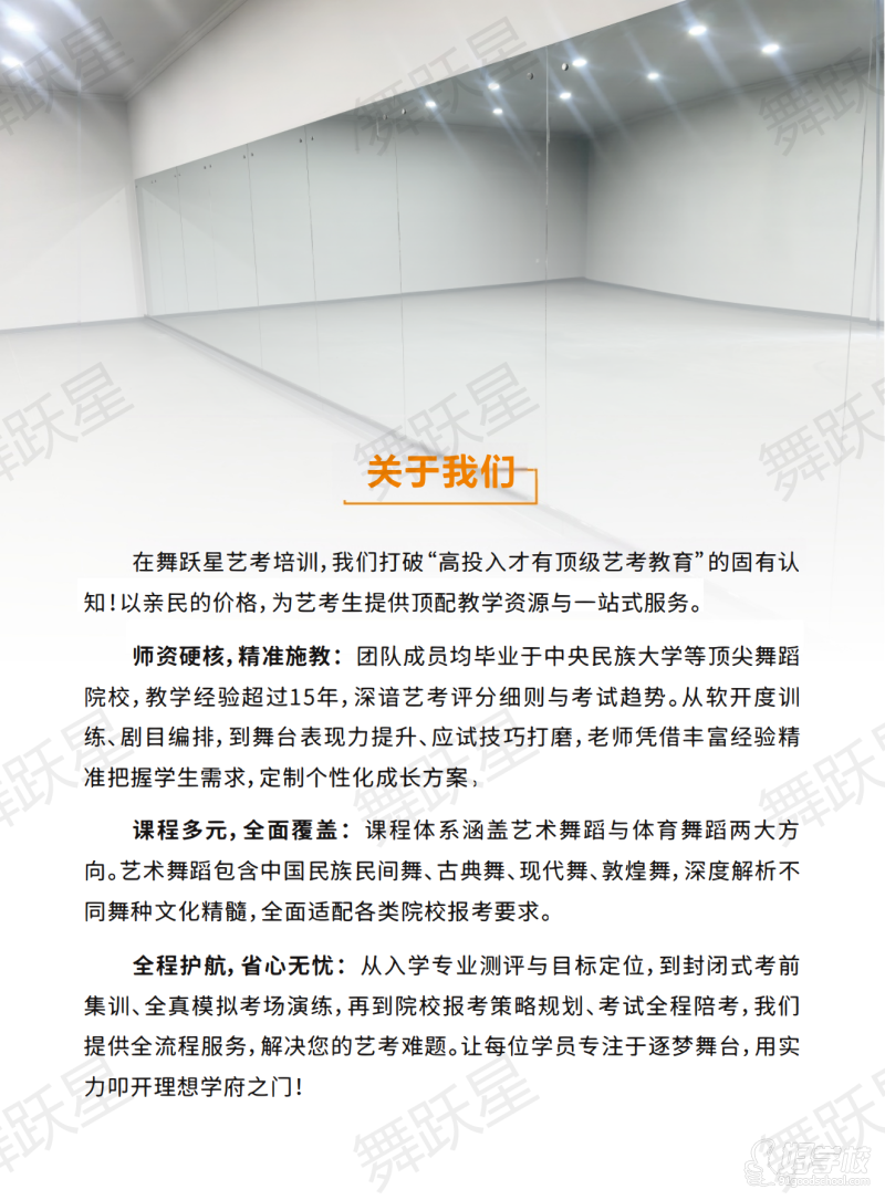 舞跃星艺考是专注于舞蹈专业人才培养的教育机构,致力于为学生提供系统化、专业化的舞蹈艺术教育。机构依托优质艺术教育资源,构建了以中央民族大学为主的科学完善的专业舞蹈教学体系,机构教师多年来培养了大量具备专业素养的舞蹈人才。我们秉承"因材施教、全面发展"的教育理念,通过个性化培养方案和小班制教学模式,着力提升学生的专业能力和艺术修养。
