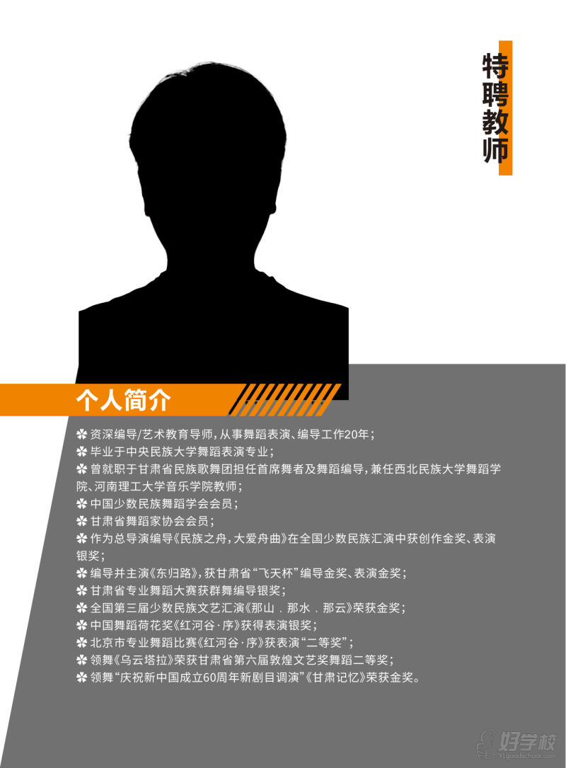 曾就职于甘肃省民族歌舞团担任首席舞者及舞蹈编导,兼任西北民族大学舞蹈学院、