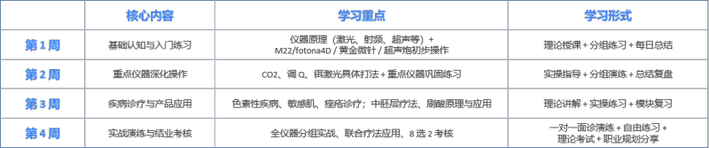 长周期集训:60天高强度学习,涵盖皮肤管理、注射技术等核心领域。