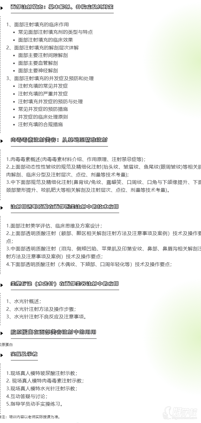 真人示教:专家现场使用真人模特,完整演示肉毒毒素、玻尿酸、水光针注射全过程,同步讲解操作细节(如注射层次、点位选择、剂量控制),直观呈现规范操作流程。