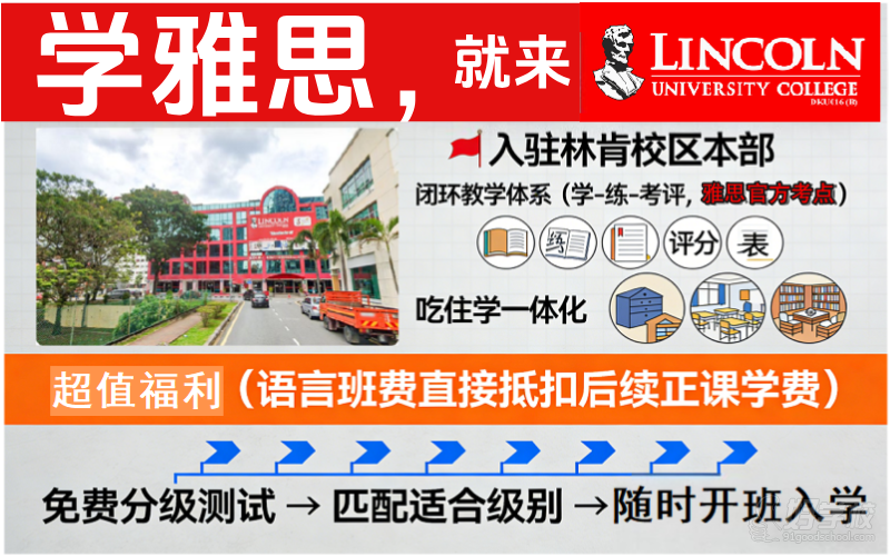 林肯大学学院是雅思官方考点,使用林肯大学学院自编教材授课